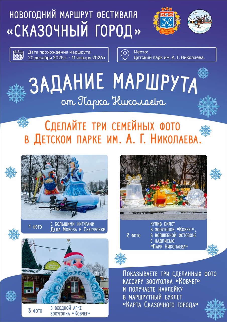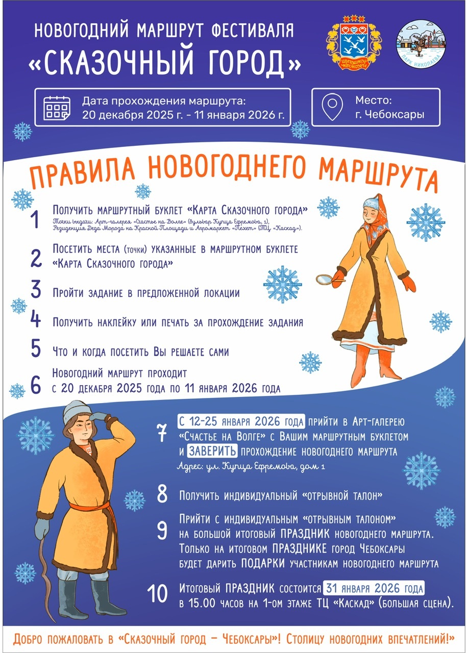 Дорогие друзья! С 20 декабря по 12 января наш любимый город Чебоксары превратится в настоящую сказку! 🎄✨ Фестиваль «Путешествие в сказку» объединит более 20 волшебных площадок, где вас ждут незабываемые праздничные активности. Парки, дворцы культуры, театры, музеи, катки и даже резиденция главного Деда Мороза — каждый уголок будет наполнен атмосферой праздника!