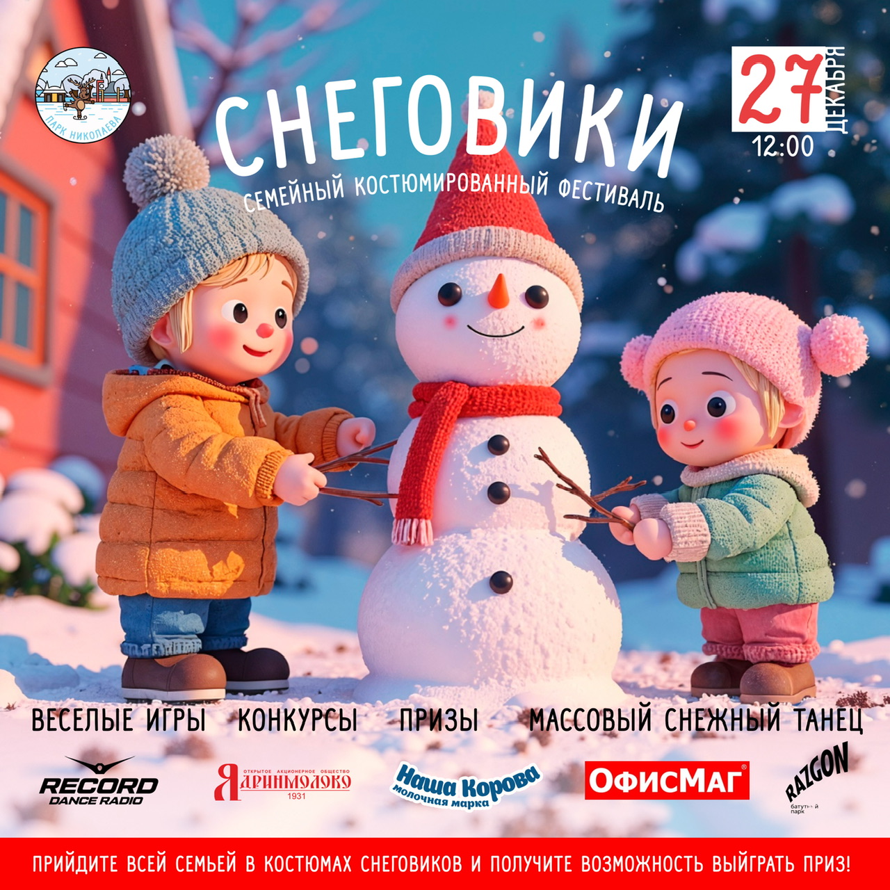 27 декабря в 12:00 Парк Николаева превратится в настоящую снежную сказку! Мы приглашаем детей и взрослых на самый дружный и веселый зимний праздник — семейный костюмированный фестиваль «Снеговики».